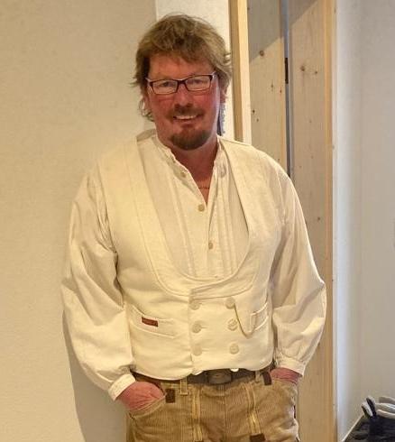 Mann mit Brille trägt eine weiße Bluse und geschnürte beige Hosen in einem hellen Raum mit Holzdetails.