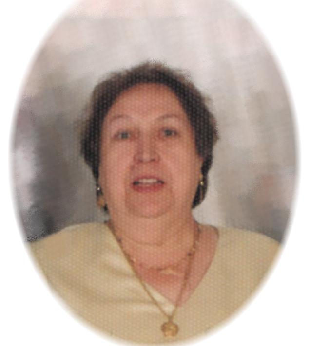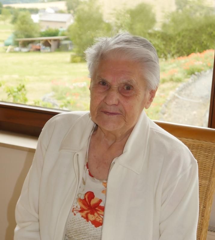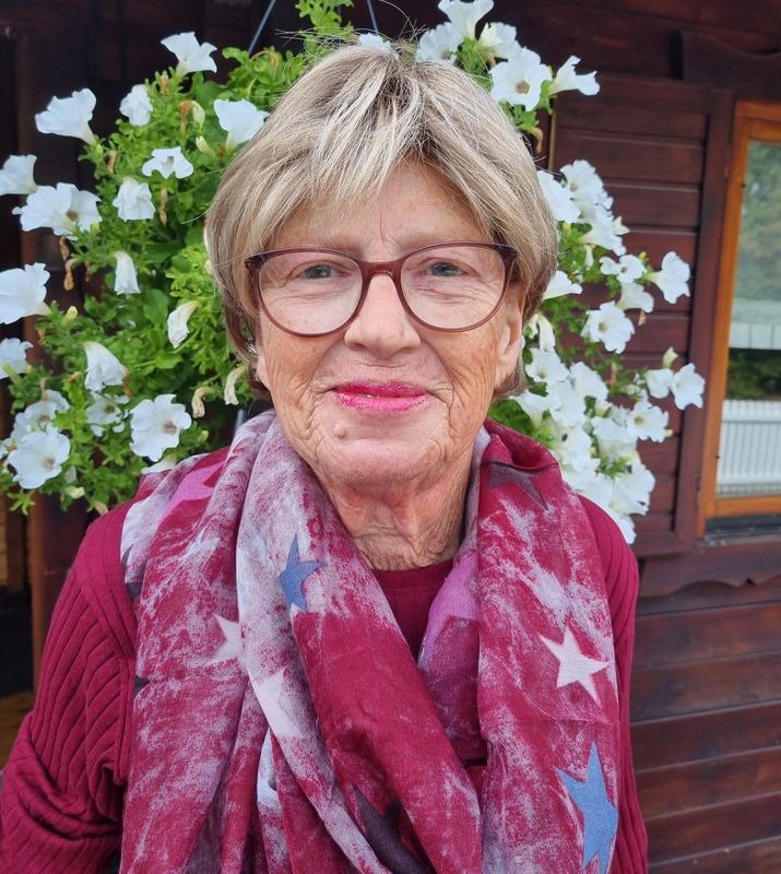 Ältere Frau mit grauen Haaren sitzt an einem Tisch, im Hintergrund eine grüne Landschaft und Blumen.