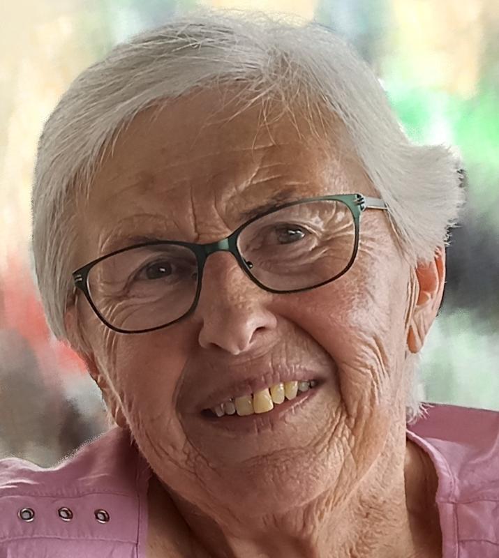 Lächelnde ältere Frau mit kurzen grauen Haaren und Brille, getragenes pinkes Oberteil, unscharfer bunter Hintergrund.