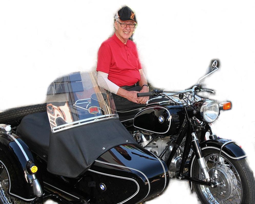 Älterer Mann in rotem Shirt sitzt auf einer schwarzen BMW mit Beiwagen und lächelt in die Kamera.