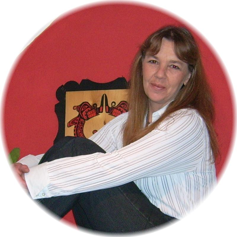 Frau mit langem Haar in gestreiftem Hemd sitzt mit angezogenen Beinen vor roter Wand und einem hölzernen Kunstwerk.