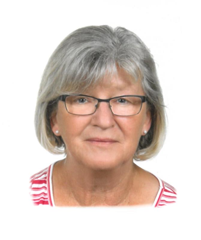 Porträt einer älteren Frau mit grauen Haaren und Brille, lächelnd vor neutralem Hintergrund. Sie trägt ein gestreiftes Shirt.