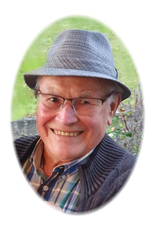 Lächelnder älterer Mann mit Brille und Hut, Porträt vor grünem Hintergrund.