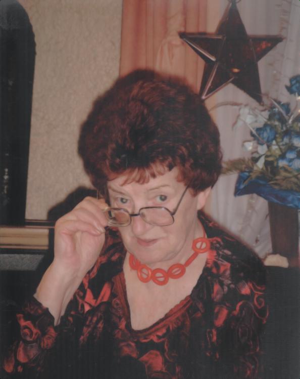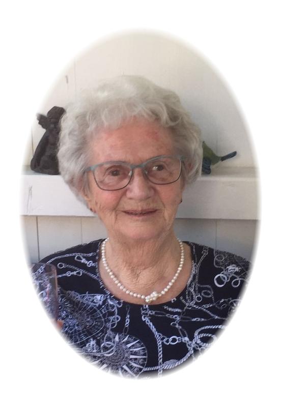 Portrait einer älteren Frau mit grauem Haar, Brille und Perlenkette vor einer hellen, schlicht dekorierten Wand.