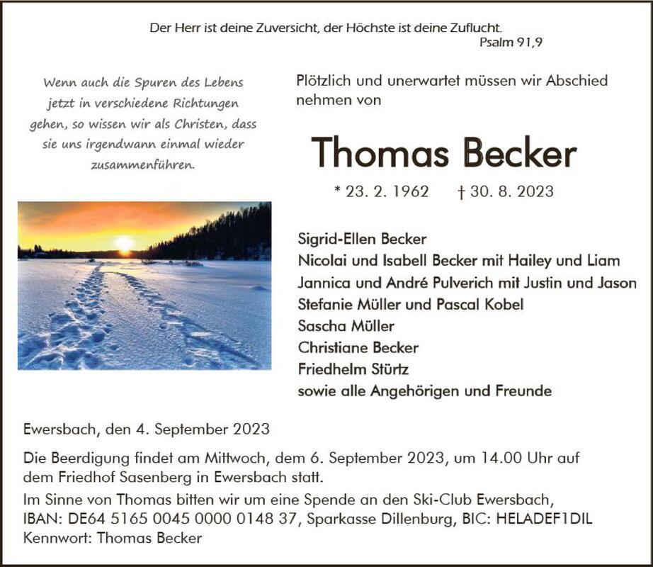 Traueranzeige für Thomas Becker aus Dietzhölztal, der am 4. September 2023 verstorben ist.