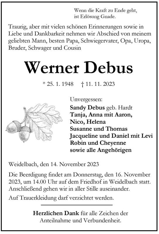 Sterbebild für Werner Debus mit persönlichen Erinnerungen, Geburts- und Sterbedatum sowie Traueranzeige.