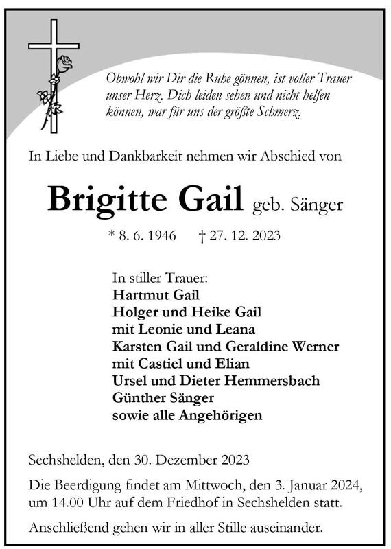 Traueranzeige für Brigitte Gail, geb. Sänger, mit Namen der Angehörigen und Beerdigungsdetails.
