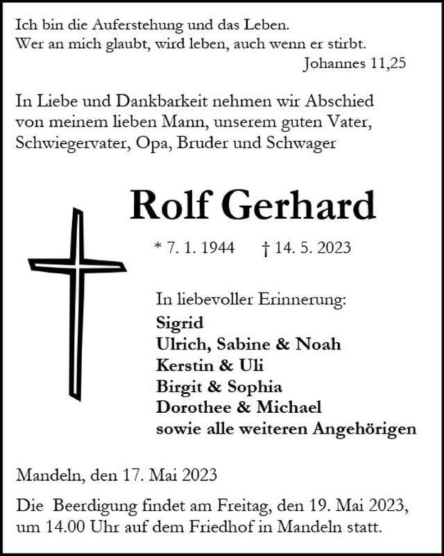 Traueranzeige für Rolf Gerhard mit Angaben zu Geburt, Tod und Beerdigung sowie Namen der Angehörigen.