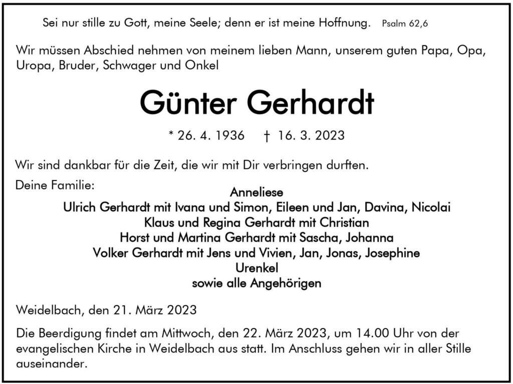 Sterbebild für Günter Gerhardt mit Geburts- und Sterbedatum sowie Familienangehörigen und Beerdigungsinformationen.
