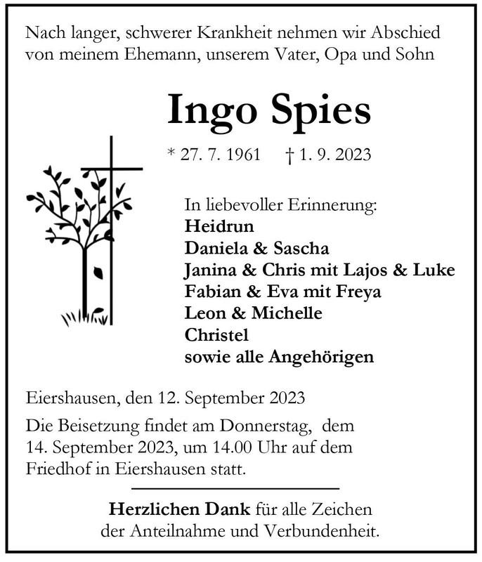 Traueranzeige für Ingo Spies mit Geburts- und Sterbedaten sowie Namen der Angehörigen und Beisetzungsdetails.