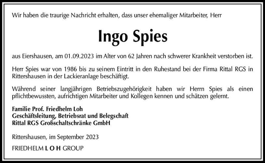 Nachruf auf Ingo Spies, der am 01.09.2023 im Alter von 62 Jahren verstorben ist, mit Danksagungen der Familie.